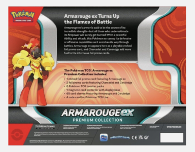 Unleash the ultimate power of Armarouge ex! An unstoppable force, wrapped in legendary armour, ready to turn the tide of battles. Challenge any adversary as you command its potent Ability and brilliant attacks. Whether boosting defence or putting pressure with ruthless offence, Armarouge ex offers a fierce advantage. Acquire the etched foil promo card enriching your strategy with Charcadet and Ceruledge. Fuel your excitement with SIX booster packs, ‘visit’ protection of the magnetic card protector and elegance with card sleeves. Get ready to ignite your game!.